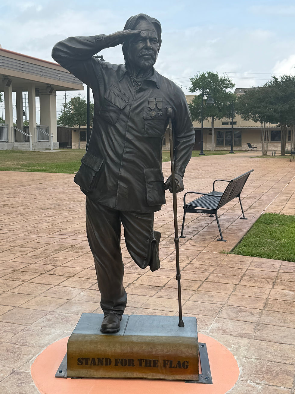 A hero stands in salute above the words, “Stand for the Flag,” facing the monument—facing the heroes raising the flag at Iwo Jima, facing the silhouette of a fallen warrior, and for me, it feels even more personal. He stands in honor, saluting the flag draped across our son’s casket.